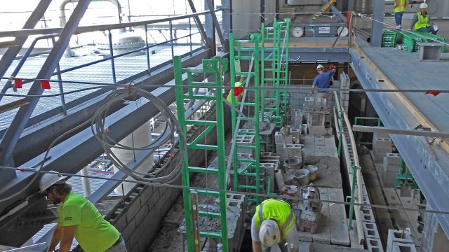 Scaffolding industry veteran Justin Breithaupt discusses the project “tough spot” of the elevator shaft.