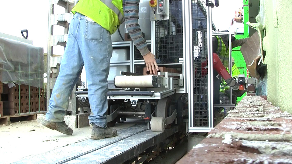SAM100 uses a laser beam string line to accurately place a brick, while in the foreground a mason tender from Manning Construction adds bricks to the system’s conveyor.