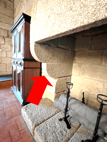 The operational chimneys service the fireplaces. Figures 14 and 15 show the ornate granite craftsmanship. The cantilevering stone (arrow) is impressive.