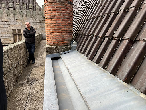 Figure 16 shows the base of one of the non-functioning chimneys. This specific one bridges the roof gutter, while others are constructed on the parapet.