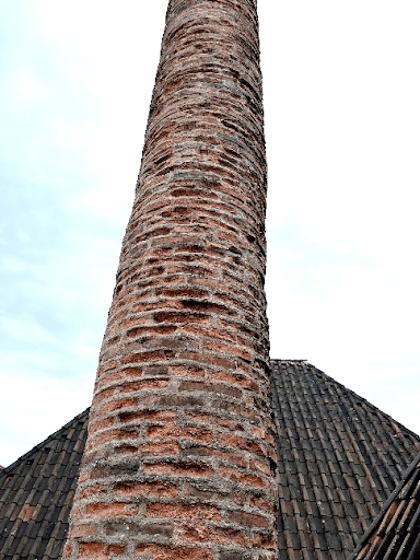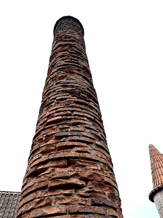 These 4-foot diameter chimneys are as tall as 27 feet. The bricks are approximately 7 inches thick. Their stability is dependent on the weight of the chimney to resist wind loads (earthquake loads in this part of Portugal are low). One of the west-facing chimneys developed a lean and had to be pinned to its base with drilled and grouted rods.
