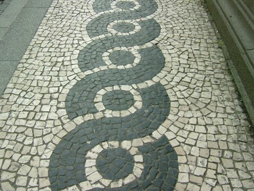 Sidewalk pavers are an art form in older European cities, including Portugal. Figures 45a through 45e show some historic patterns while Figure 45f is a modern variation. Once installed, these patterns need to be maintained following excavations or damage.