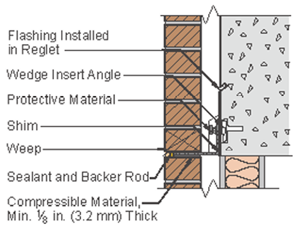 • Figure 6a shows a loose veneer lintel detail from the BIA used with CFMF backup. Note that this detail has jamb bricks that return and enclose the cavity at the window level; the window frame is set back to the CFMF. This jamb provides full bearing support for the angle. If the jamb brick does not fully return as in Figure 6b (an authored modified version of Figure 6a), the angle only bears on a portion of the jamb. The engineer should check the bearing stresses closely due to eccentricity.