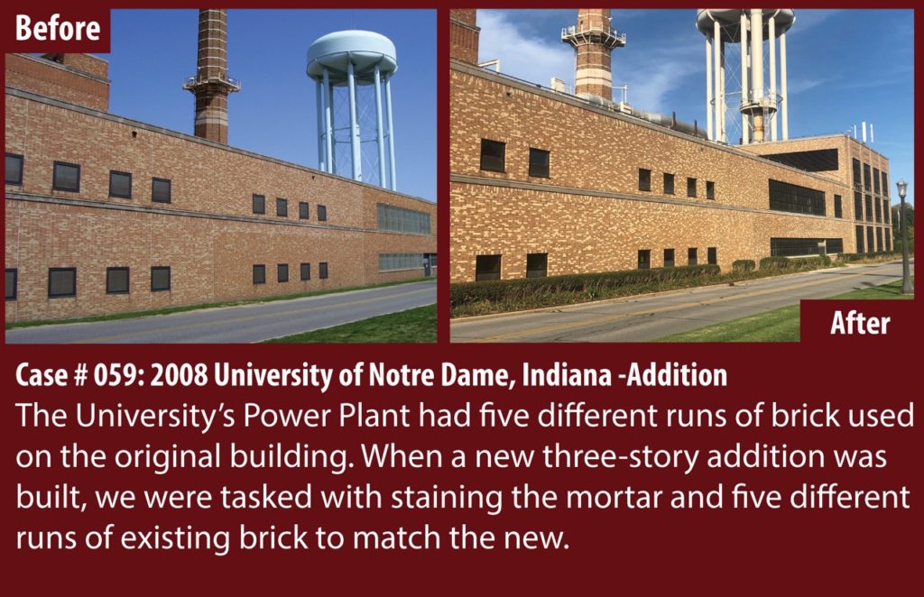 Below is an example of a project at the Power Plant of the University of Notre Dame. The original building had at least five different runs of brick, which included varying colors of mortar as well. The original brick on the building and mortar were stained to match the new three-story addition.