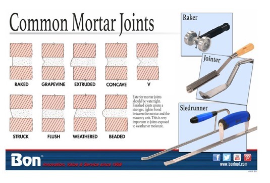 At Bon Tool Company and other manufacturers with a wheelhouse in Masonry, some vital hand tools would include; sled runners, slickers, rakers, and jointers. All of the above have similar utilization, the focus of this article will further examine the varying types of Masonry Joints and the need for varying hand tools to achieve the varying and proper aesthetics.