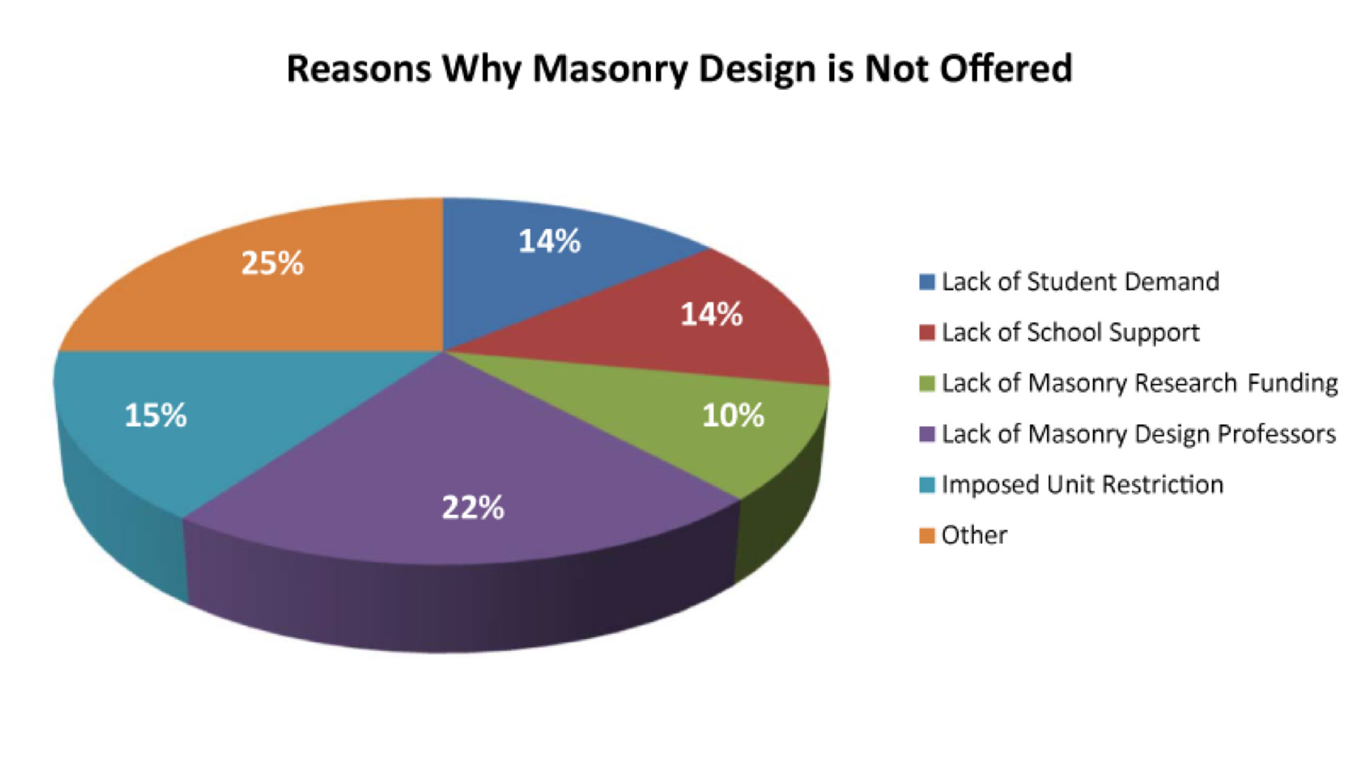 The article indicates that Masonry Design is offered less frequently than any other core class recommended by the NCSEA, with only 40% of the schools surveyed even offering a Masonry Design course, and this is not a brand-new development. The article states, "Past survey results have indicated that Timber and Masonry Design courses are not taught at nearly the same frequency as Steel and Concrete Design courses." The survey included an additional question regarding the reasons for masonry courses not being offered at universities. Some of these obstacles can be overcome with the cooperation of the masonry industry, including individual masons. Programs like the Educators' Workshops hosted by The Masonry Society are already helping train qualified masonry instructors for engineering and architecture schools.