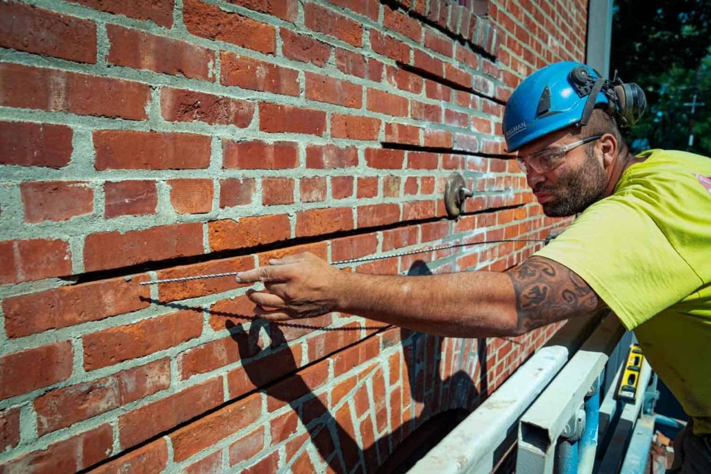 Helical beaming is fully concealed, leaving repairs virtually undetectable post-installation. That’s because the beaming is set back into the joint, allowing the repointing to be done with mortar that matches existing joints in the wall. It’s also a safer method than shoring because it strengthens the wall before existing bricks are removed.