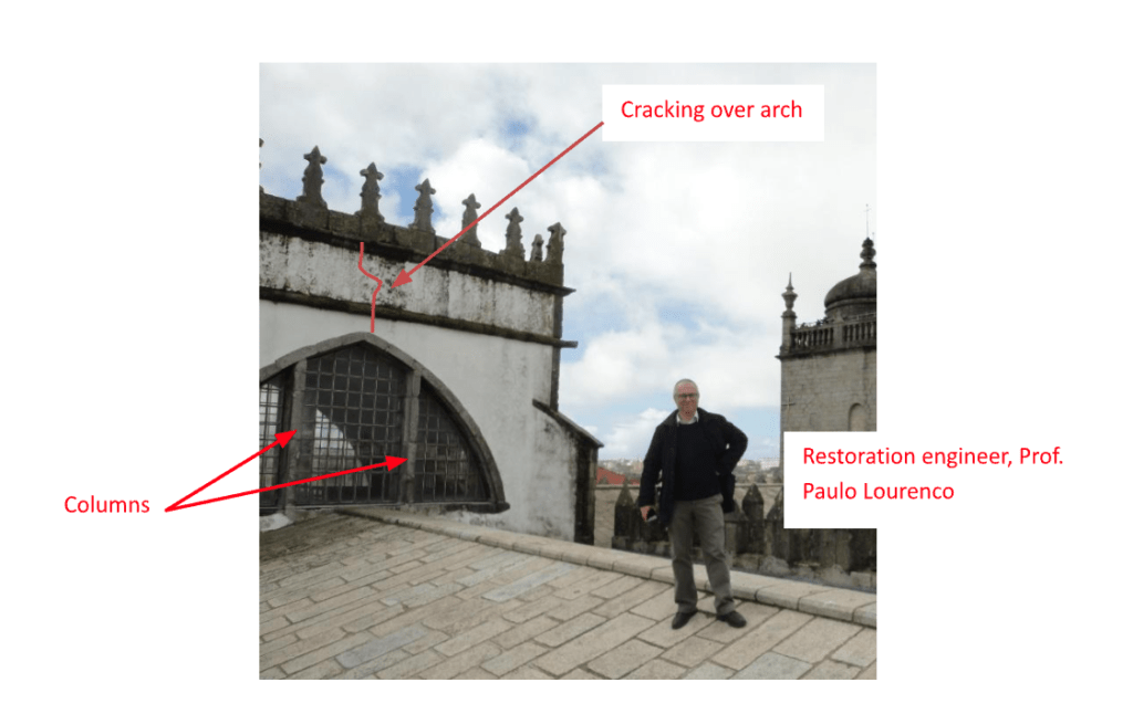 Figure 15 shows the upper arch opening before the scaffolding was installed. Like the arches at the Porto Cathedral skylight, the arch here also has columns that disrupt the arching action of the masonry.