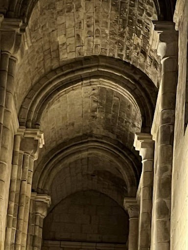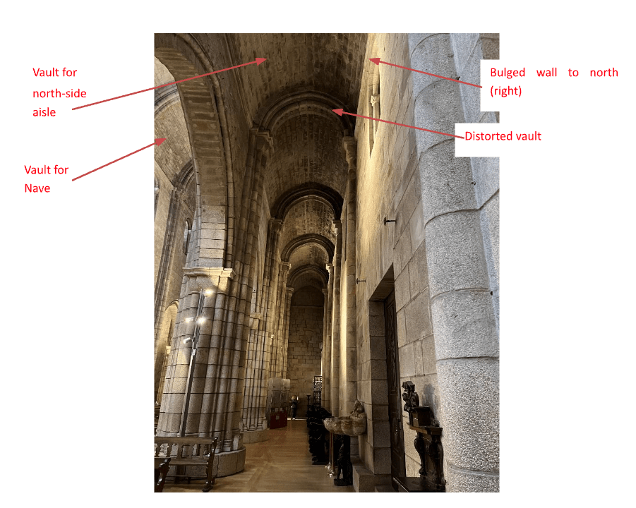 Throughout the cathedral, there are numerous signs of foundation settlement. The nave is supported by a barrel vault, as are the narrow side aisles. Figure 11 shows the north-side aisle. It’s not an optical illusion; the aisle vault is distorted, and the wall is bulged outward.