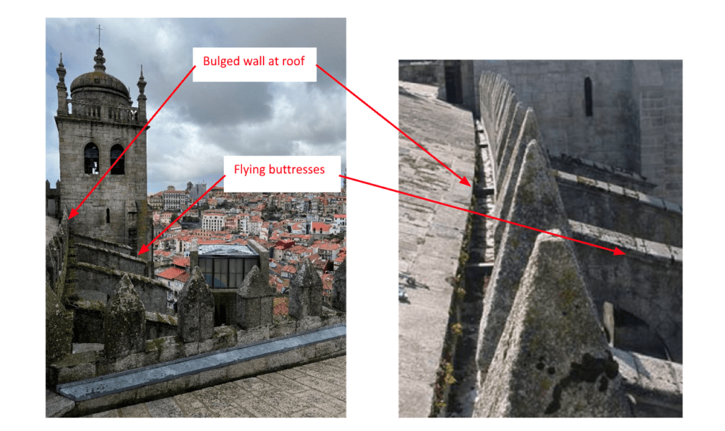 The bulge is surprising, considering the nave has flying buttresses for lateral support. Figure 12 shows the bulge on the north side; it occurs similarly on the south. The cathedral is unique in that it was one of the first in Portugal to have flying buttresses.