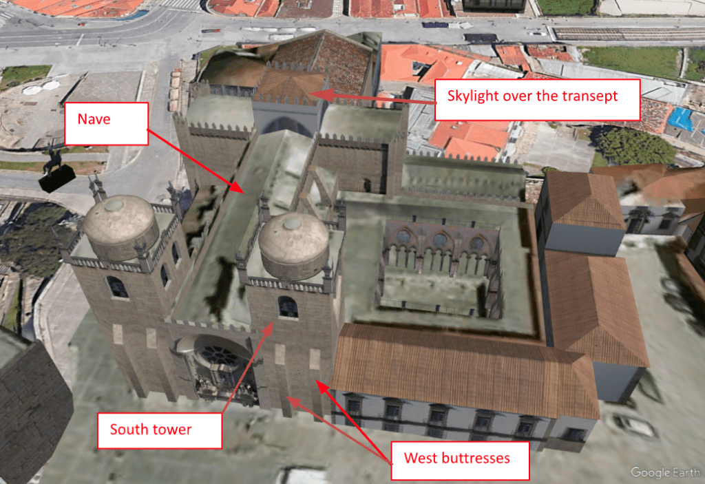 While there were many recent restoration projects, I will highlight a few that were required to correct work done in the early 20th century. These include the south tower, the nave and the skylight, as seen in Figure 3. The graphics and information here are provided courtesy of P.B. Lourenco, L.F. Ramos, and K.J. Krakowiak in their paper Cathedral of Porto, Portugal: Conservation Works 2003-2008 from the 11th Canadian Masonry Symposium, 2009 (P.B. Lourenco et al.).