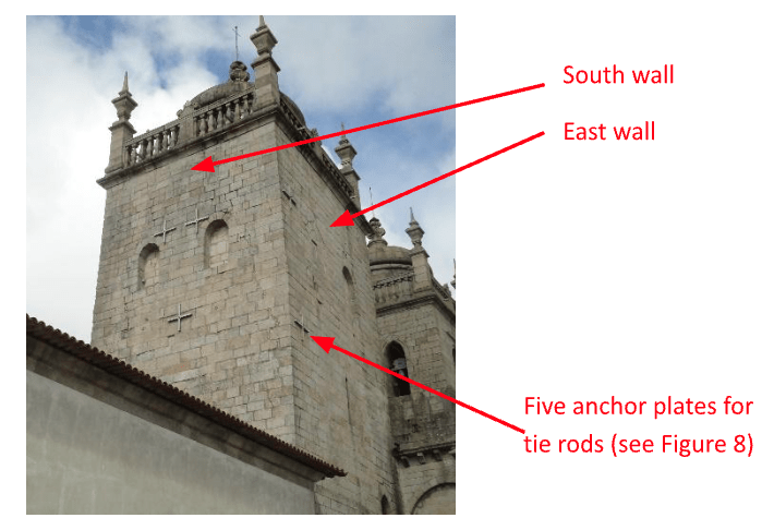 The broken tie rods were replaced with stainless steel rods, and additional ties were added. Figure 7 shows the south and east walls and the specially designed anchor plates for the tie rods designed as crosses, which had to be approved by church officials before they were installed. The tie rods between the east and west walls were drilled through the rubble portion of the walls.