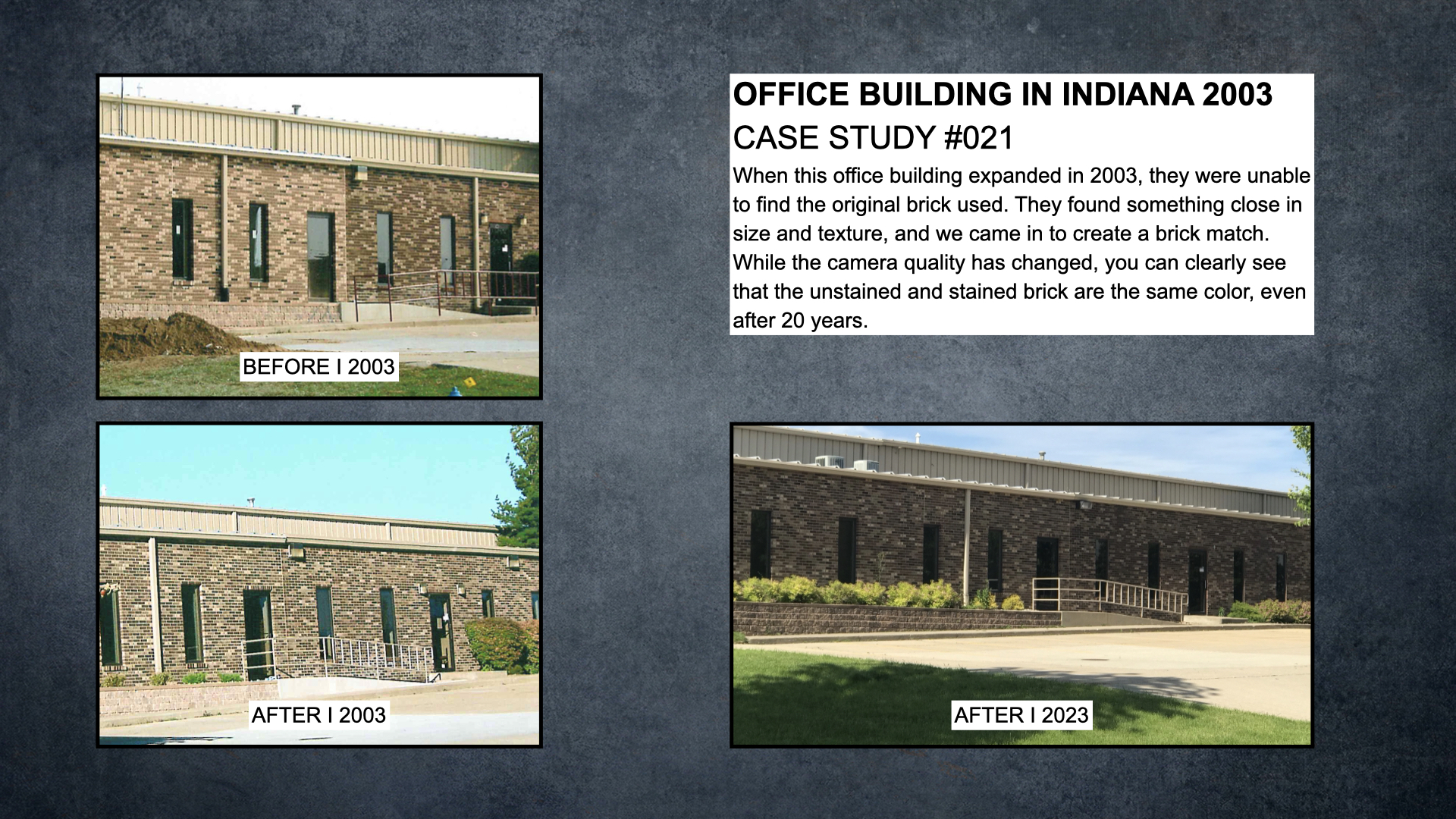The Benefits of Staining Brick: The Product of an Ever-Changing Industry Words: Don Foster, MASONRY COSMETICS, INC.Photos: MASONRY COSMETICS, INC.Brick has been used for thousands of years as a building material, renowned for its strength and durability. Whether constructing a home, office building, or even a simple fence, brick remains a reliable choice. However, in today's brick industry, a significant shift is occurring: availability. The once-plentiful supply of brick for matching has dwindled, with many brick plants and distributor locations having closed their doors.The Challenge of AvailabilityThe industry's changing landscape has created a gap in the availability of brick. Discontinued product lines and special-order-only brick, with increased minimum purchase quantities, make finding the perfect match for repairs or additions an even greater challenge. Many historic buildings were constructed with unique or discontinued brick, complicating restoration efforts and making seamless matches nearly impossible.Comments frequently heard throughout our industry are: "The Brick Manufacturer does not produce this brick anymore, and the options we have available are less than ideal." As technology evolves, the brick industry has undergone substantial changes. This shift has left many struggling to achieve seamless and precise brick matches for expansions or repairs and raises this question today: Why is it so easy for a brick salesman to suggest using mismatched brick for a building addition and then also recommending the same customer to just paint the entire structure?This quick and easy suggestion can compromise the brick wall's durability and does not preserve the look and integrity intended for brick structures. This suggestion also changes a maintenance-free brick and may create a future ongoing maintenance issue.This situation does not support the brick industry very well, explaining in part why brick has lost market share to alternatives like fiber cement siding. It's because the average brick salesperson often fails to grasp the importance of achieving a match that illustrates the long-lasting success of using brick, while at the same time protecting the integrity of the industry. We can do better, for ourselves and our customers.The days when architects could depend on knowledgeable brick matching salespeople to find or create the perfect blend for their projects are few and far between because many salespeople and customers have not quite grasped the simplicity of packaging brick staining early on in the brick matching process. Brick staining is a powerful tool to use when you cannot find a good brick that matches, or you cannot get a combination of blended brick by hand to match your project. Brick staining can be used as a tool to close more sales and satisfy more customers.Staining Brick as a SolutionEnter brick staining—a technique that has risen in popularity due to its ability to provide aesthetically desirable solutions without compromising a structure's integrity. Rather than making brick stronger or more durable, staining offers the opportunity to color-match new bricks with existing ones. This technique is particularly beneficial for architects and builders trying to match the materials for restorations or new additions and has been embraced by both educational institutions and corporate entities that wish to maintain the consistent look of their buildings while ensuring durability.Brick Staining Techniques and BenefitsStaining brick involves altering the color of existing or new brick while preserving their durability. The importance lies in selecting the right stain with the brick combination of size, texture, and color. The technique allows architects and contractors to achieve a level of precision in aesthetics that once seemed difficult to attain.The greatest advantage of staining is using the right stain that does not create a superficial layer that can peel, crack, or blister. Utilizing transparent stains ensures that the coloration will weather naturally, much like the original brick. By absorbing into the pore structure of the brick, these stains become one with the brick, similar to a tattoo, embedding the dye into the pore structure of the skin.Proven ApplicationsA notable case showcasing the effectiveness of brick staining took place back in 2002 at a university in Texas. The project required the addition of a dark header pattern forming diamonds in the wall texture that was unavailable. By applying a stain to each brick selectively, the project successfully achieved a seamless appearance—which remains unscathed over two decades later.Selecting a proven brick stain is critical to long-lasting results. Companies offering quality stains often provide case studies and field-performance records demonstrating their products' effectiveness over time, so potential buyers can have confidence in their selection. The Importance of ResearchIf you are unsure about choosing a quality brick stain, it is important to do some research. Ask for case studies from prospective companies. Many companies that have been in the business for over 20 to 30 years should be able to provide hundreds of examples of proven field performance.Be cautious of case studies that serve merely as attractive marketing pieces without substantial evidence. Authentic case studies should demonstrate the project's initial appearance, the outcome after staining, and an up-to-date photo to verify longevity. Additionally, pay attention to 20 to 25-year warranties that only offer a prorated product replacement based on the remaining warranty period.Imagine a scenario where the stain fails, resulting in the color fading to an unappealing shade. Although you may receive some replacement stain, simply applying the replacement product over the existing failed product will not solve the problem.Failing stain projects could diminish the aesthetic value of the structure, impact its resale value, and unfairly