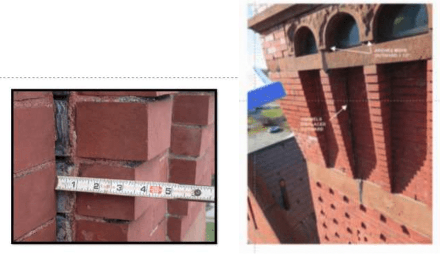 Figure 10 shows some of the critical displacement at the corbeled section of the wall. Since the face brick is headered to the backup wythes, bulging indicates either broken or displaced headers. Either way, the attachment of the face brick has been compromised. There are also signs of displacement of the brownstone banding.
