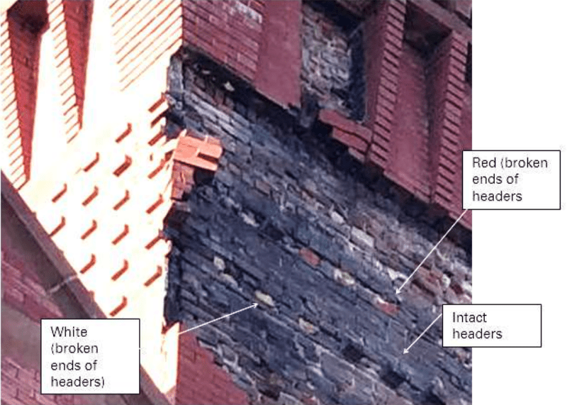 - Red units are newly broken headers. These units were likely keeping the bulging façade intact just before the collapse. None of the headers pulled out of the wall.