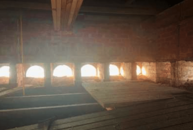 With Phase 1 complete and most of the safety concerns about the upper masonry relieved, efforts turned to installing wood framing as shoring (Figure 23) to further support the upper masonry. Winter conditions and cost prevented infilling/rebuilding the collapsed area with brick.