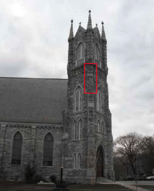 In December 2020, an area of the clock tower façade collapsed (see box on Figure 8 for location). This area had been deemed Critical in the assessment report and was slated for repair and rebuilding. The assessment report provided photographic documentation of the condition before collapse (Figures 9 and 10). The arrows have been added to the report photograph; red indicates an area of bulging brick, and yellow signifies significant cracks.