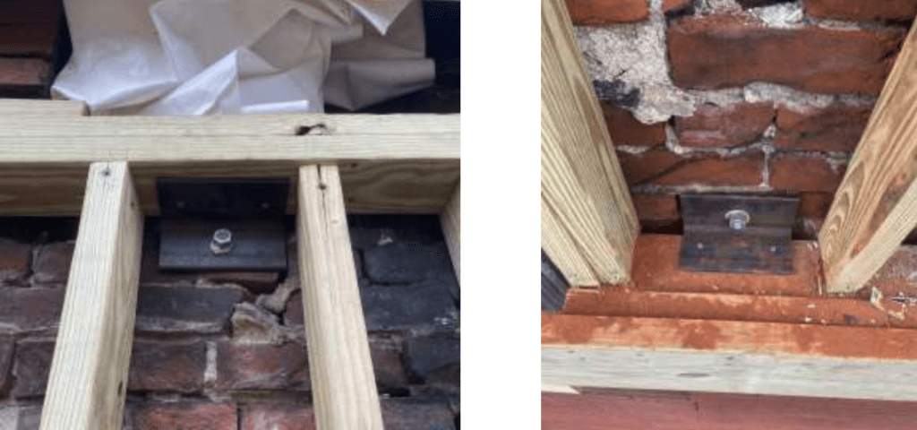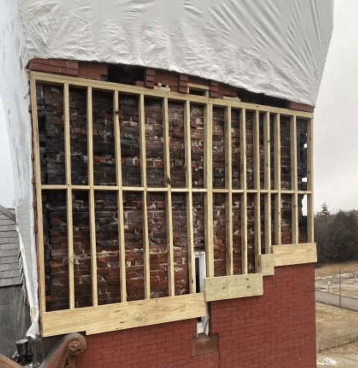 Normally, masonry restoration anchors would be used in the remaining brick below the collapse area. In this case, 2 x wood boards were used to retain the remaining top courses from bowing outward due to the vertical shoring loads.