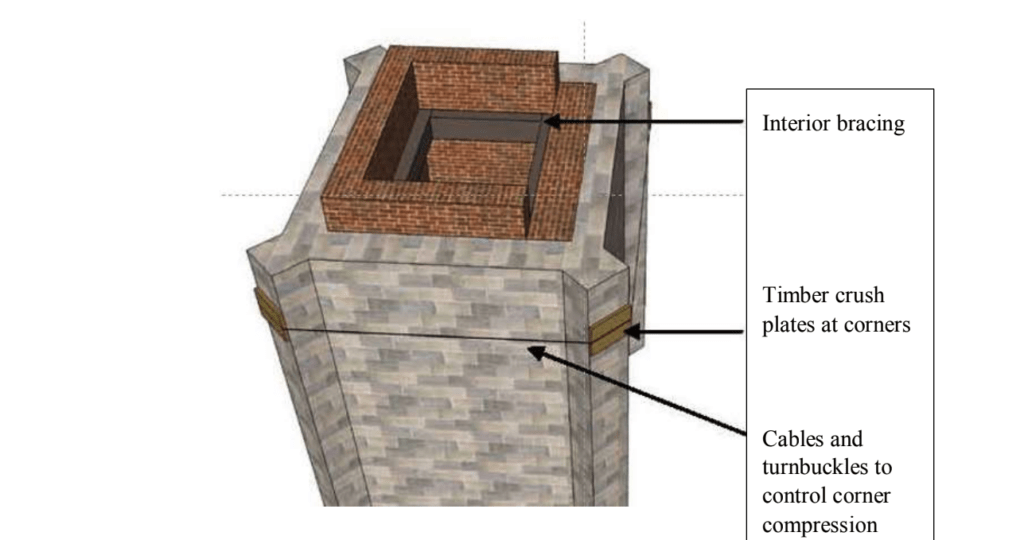 Together these two examples of tower stabilization indicate that the solutions vary based on the conditions of the masonry and the condition of the overall walls or buttresses. Every building has to be individually evaluated.