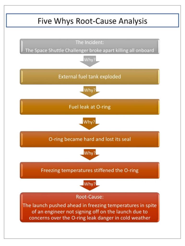 The number five in the Five Whys method is not magical. There is no real significance to the number five. It is simply a rule of thumb that, in most cases, gets you down to the root of most problems. There are incidents that are born out of such a complex process that five “whys” are not near enough to outline the events that led up to the final incident. This is the case with the Space Shuttle Challenger tragedy that we began with. There were too many moving parts, pieces, people, processes, and problems to chart this catastrophe adequately in just five steps. Following I have gone ahead and created a Five Whys flow chart to outline the Challenger chain of events leading back to the root-cause, just for a simplistic example of the analysis process. For this example, I stuck with the rule of thumb of only five “whys”, however in a tragedy of such complexity, there could be hundreds of “whys” and additional “legs” of the flow chart as some answers can lead in different directions.