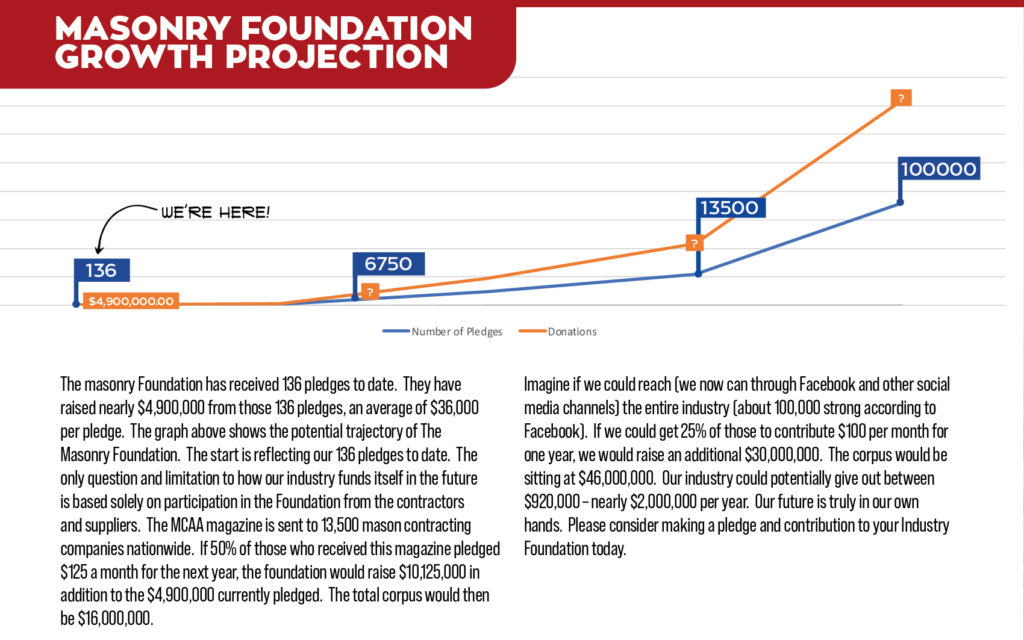 We are excited about the future for The Masonry Foundation. The development to this point has happened with only 136 industry participants. As we transition to our next phase, the future begins today. We are looking to involve everyone in our industry. There are two programs we see as vital to the continued success of The Masonry Foundation: a planned giving program and expanded industry support.