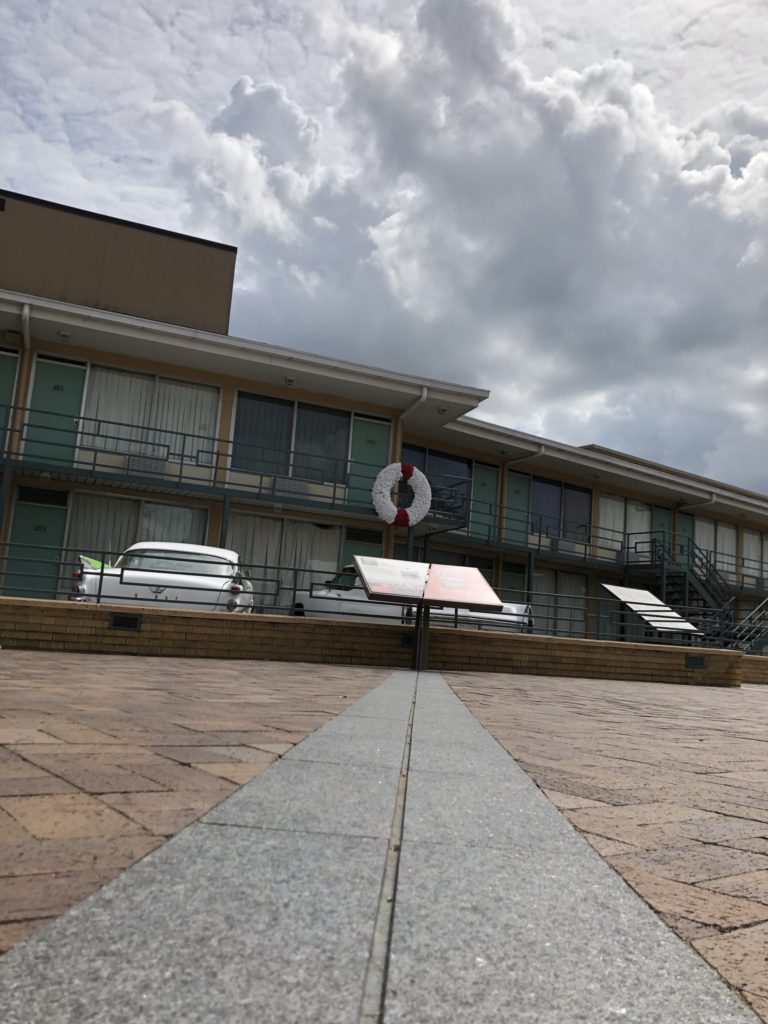 One story up was a concrete balcony and a gray art deco metal railing, upon which hung a wreath, which looked like a life preserver. Parked at ground level, where we stood in front of Room 206, were two automobiles from the era. On a low brick wall, a railing of the same design separated us from the cars. Before us, on an angle to ease its reading was a rectangular plaque with information about Dr. King’s assassination. One of the images on the plaque was the picture I mentioned earlier, a half dozen people pointing. The plaque wasn’t a solid rectangle; it was cleaved into two halves. Not in squares as one might expect, but rather at an angle and in a way that caught our attention because it seemed odd. The fingers of the people in this picture were directed at this cut. I tried to make sense of the design choice when Susie whispered, “Do you see?” and she gestured to the bricks upon which we stood.