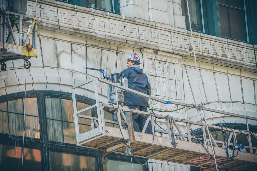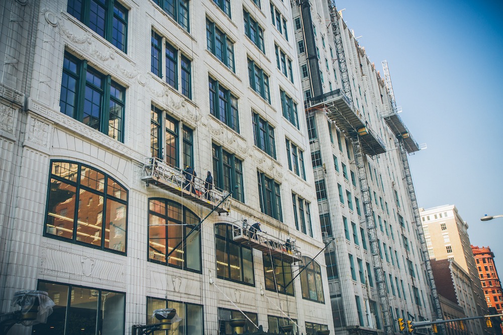To accompany its interior renovation, an exterior cleaning was ordered to remove years of atmospheric staining from carbon emissions that had built up onto the building’s white terra cotta façade.