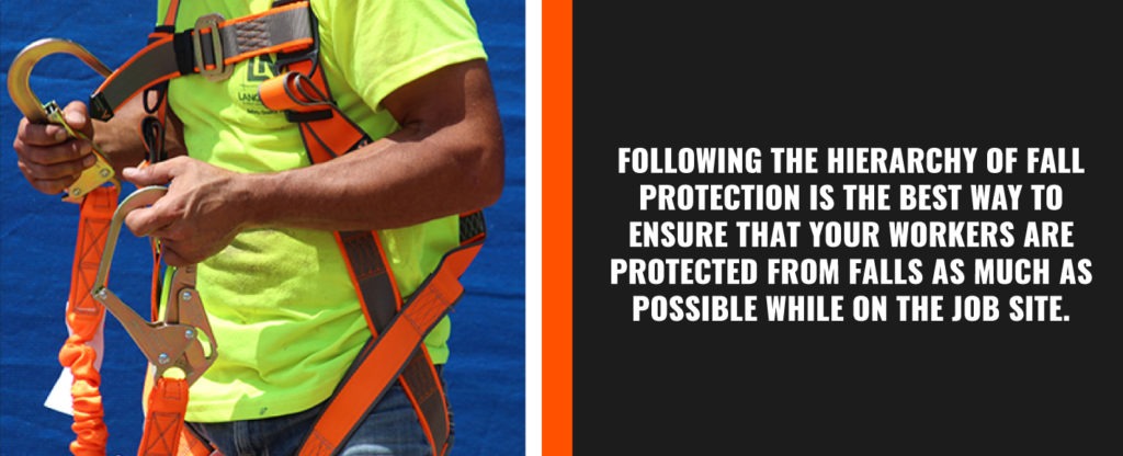 The best way to protect workers from falls is to remove the fall hazard altogether. This can be achieved by performing work on ground level and then using material handling equipment to place material at heights, engineering controls to be used at ground level, or using materials at height that require zero maintenance and inspection, if possible.