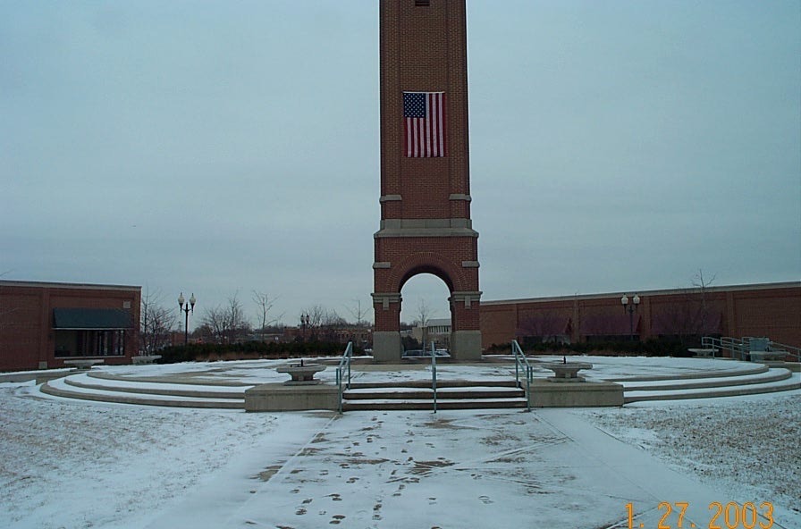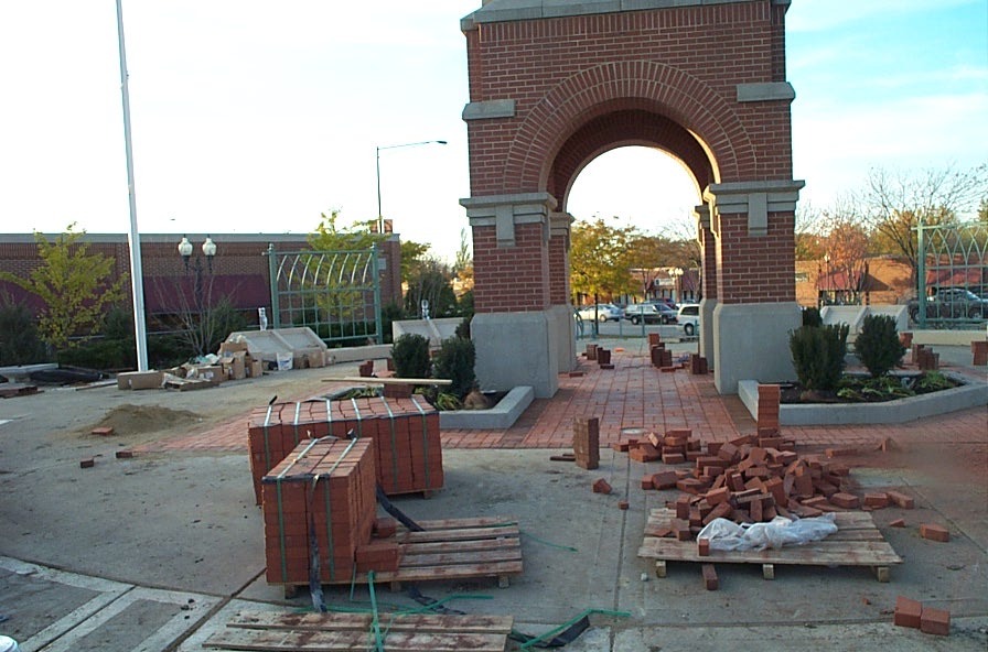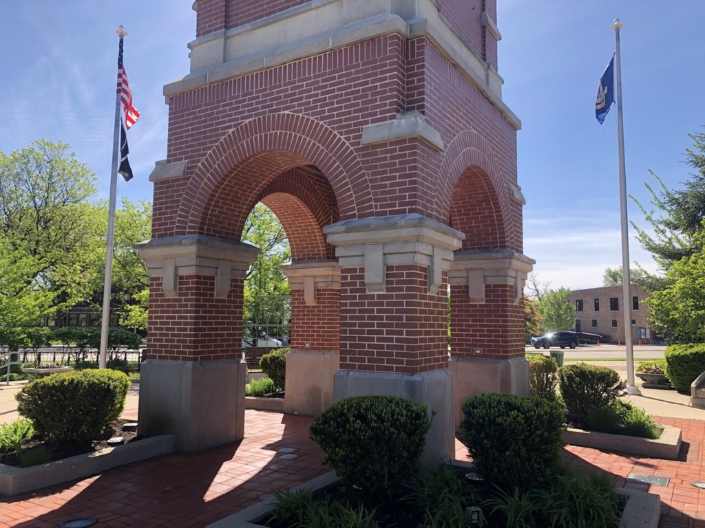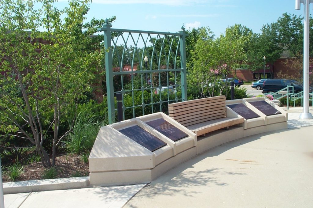 When Todd shared this idea with the committee, they bought into it, and the planning began. Preparations were made by creating drawings with the help of the Hitchcock Design Group and planning the materials needed in 2004. The idea consisted of arched trellises, curved benches, and engraved quotation plaques surrounding the area including passages regarding war and peace. Directly under the clock tower, they chose to start a memorial brick program where someone can purchase a brick in memory of a military group or veteran. There are now more than 750 bricks spread throughout the area directly underneath the clock tower engraved by Midwest Engraving. This construction was completed in 2006 by Lamp Incorporated of Elgin, IL.