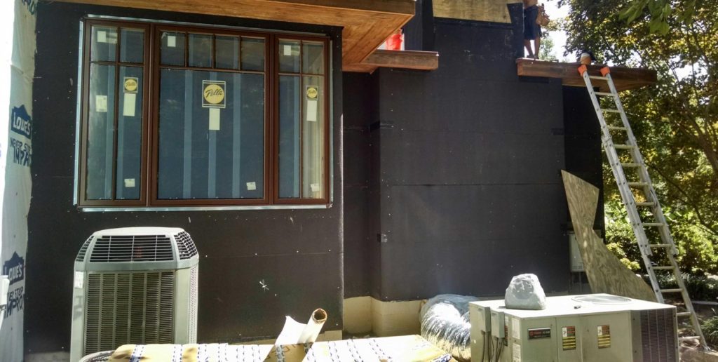 • Weather-resistive barrier: A bit of a general term, the Weather-resistive barrier (WRB) is only found on the outside walls and references a membrane that will shed water from the wall assembly.  WRB is found behind the exterior veneer material usually in two layers.