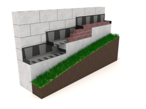 Step-down flashings are easy and efficient if planned accordingly. The first tip, build from the lowest elevation to the upper elevation; otherwise, you will rack your brain in layout. You simply lay the brick at the lowest elevation into the step-up. We recommend using a simple end dam in this location to keep water from going back into the foundation or basement of the building. Install the next course of brick above, again, directly into the step up, but you do not need the end dam this time.